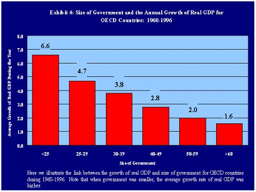 The Joint Economic Committee of the U.S. Senate and House of Representatives published a study of the relationship between economic growth and the size and functions of government. The economists who prepared the report investigated the effect of the increasing size of governments around the world on the economic growth of their respective nations. What they found was that increasing the size of government from less than 25% of the economy to more than 50% of the economy reduces the growth rate of the Gross Domestic Product (GDP) from 6.6% to 2.0%. It cuts the growth rate to a third. It is an enormous destruction of wealth.